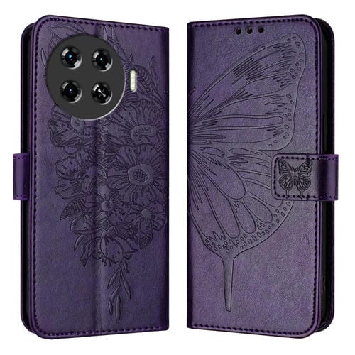 Funda de Cuero para Tecno Spark 20 Pro+ con Mariposa en Relieve (Púrpura Oscuro)