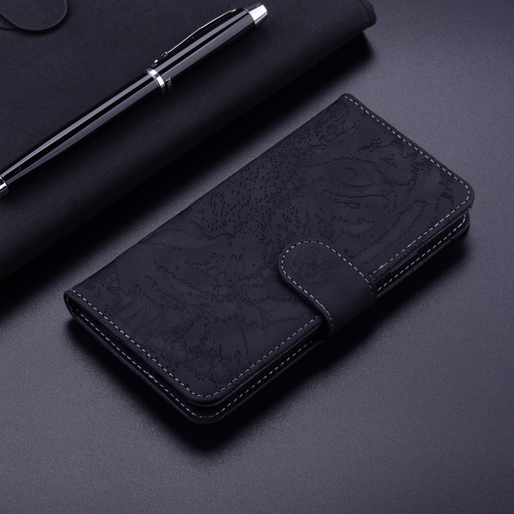 Funda de Cuero con Tapa para Tecno Spark 20 Pro Tiger Patrón en Relieve (Negro)