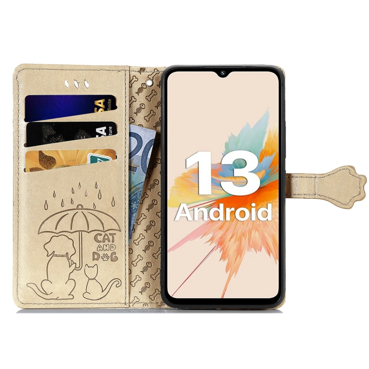 Funda para Teléfono Umidigi A11 Cuero con Relieve de Perro y Gato (Dorado)