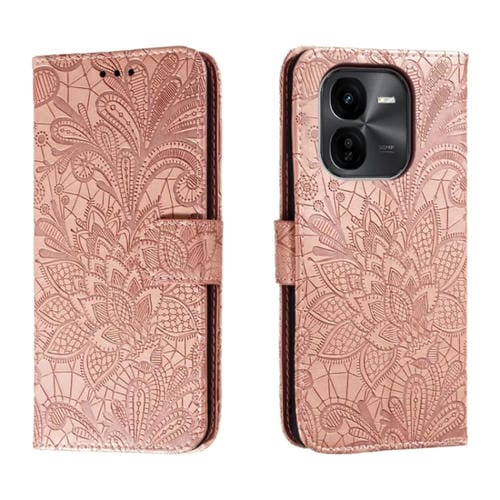 Para Vivo Iqoo Z9X Funda para Teléfono de Cuero con Tapa y Estampado de Flores de Encaje (Oro Rosa)
