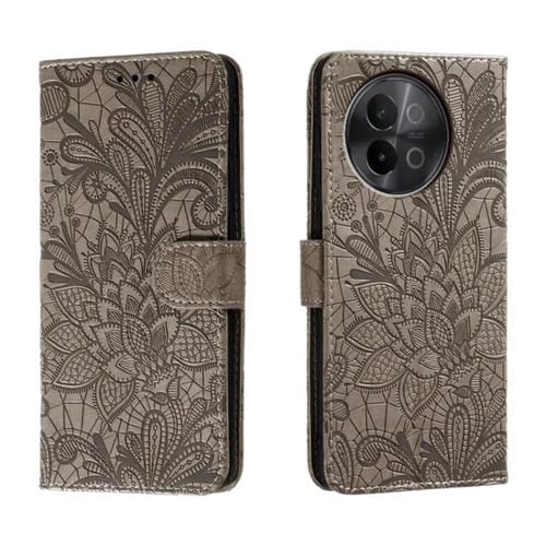 Para Vivo S18E Funda para Teléfono de Cuero con Tapa y Estampado de Flores de Encaje (Gris)