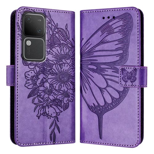 Para Vivo V30 5G / V30 Pro 5G Funda para Teléfono de Cuero con Mariposa En Relieve Global (Púrpura Claro)