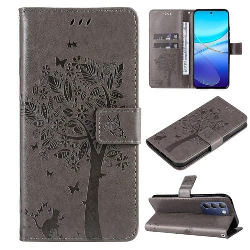 Para Vivo V40 Se 5G / Y100 Idn Funda para Teléfono de Cuero con Tapa con Patrón En Relieve de Árbol y Gato (Gris)