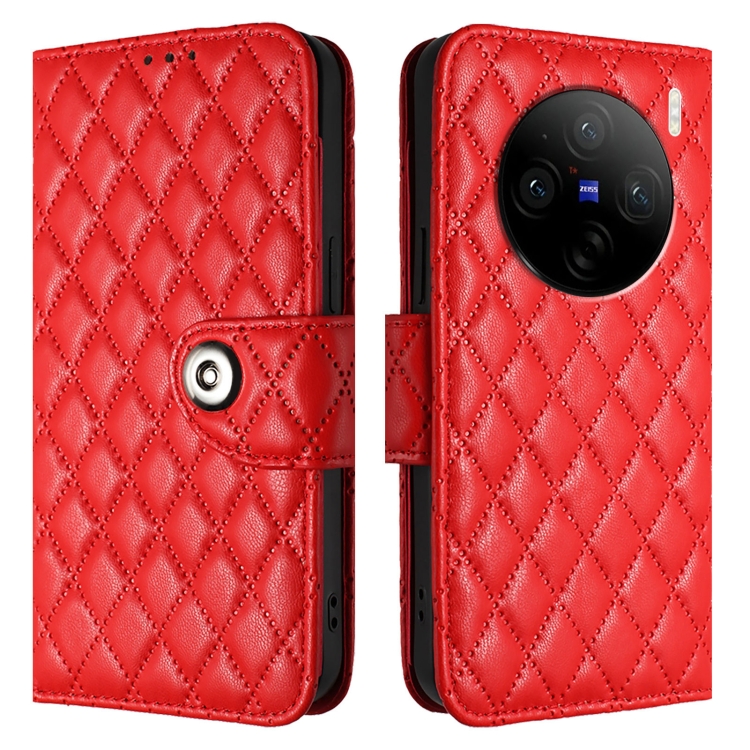 Para Vivo X100 Pro Funda de Cuero con Tapa con Textura Rómbica y Cordón (Rojo)
