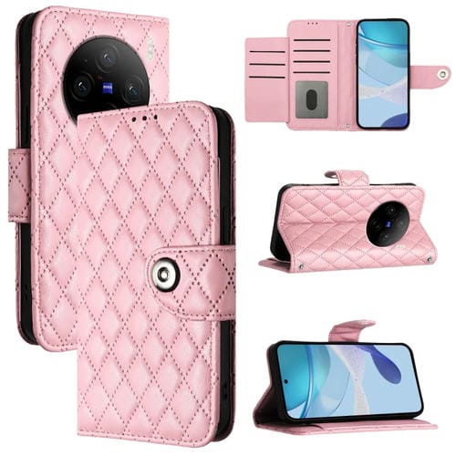 Para Vivo X100 Pro Funda de Cuero con Tapa con Textura Rómbica y Cordón (Rosa)