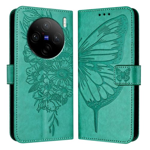Para Vivo X100S 5G Funda de Cuero con Mariposa En Relieve (Verde)