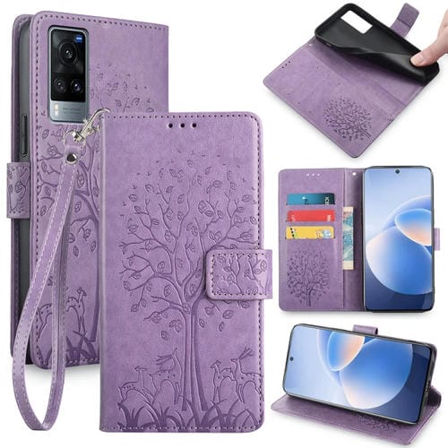 Para Vivo X60 Funda para Teléfono de Cuero con Relieve de Árbol y Ciervo (Púrpura)