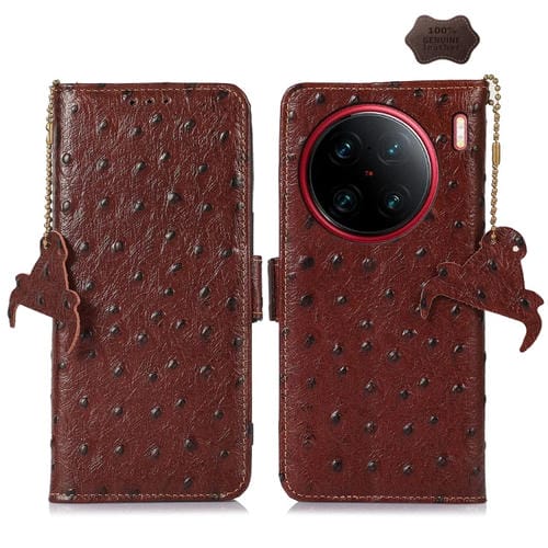 Para Vivo X90 Pro + Estuche de Teléfono Rfid de Cuero Genuino con Patrón de Avestruz (Café)