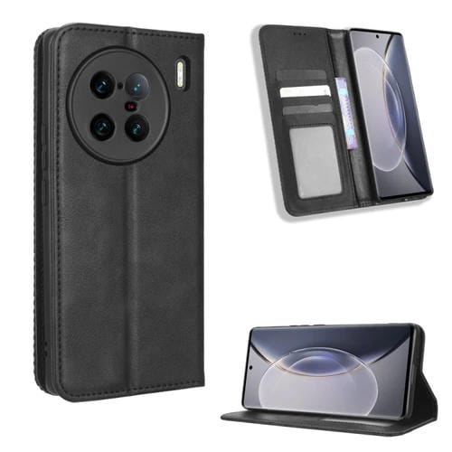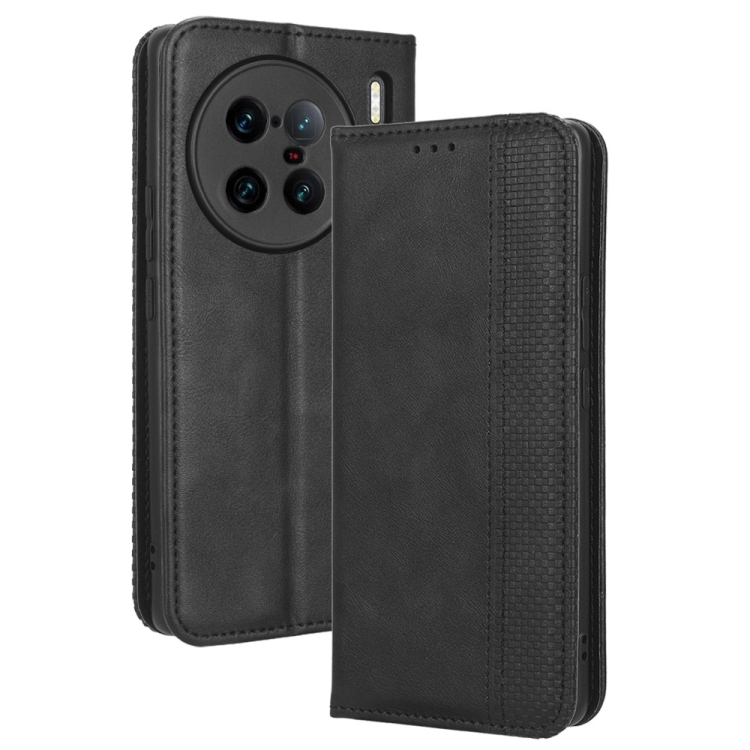 Para Vivo X90 Pro + Hebilla Magnética Textura Retro Funda de Cuero para Teléfono (Negro)