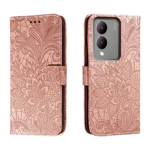 Para Vivo Y17S Funda para Teléfono de Cuero con Tapa y Estampado de Flores de Encaje (Oro Rosa)
