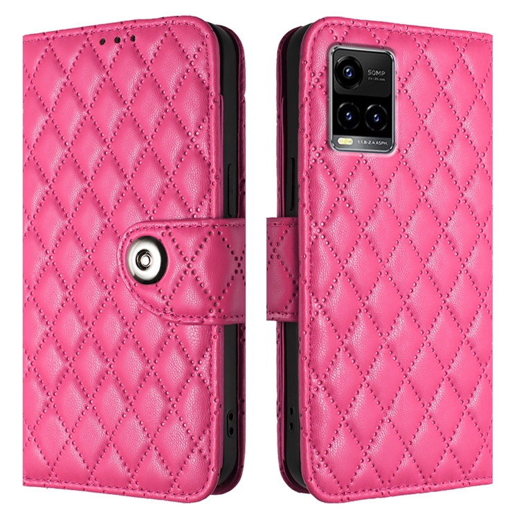 Para Vivo Y33S 4G / Y21 2021 / Y21S Funda para Teléfono de Cuero con Tapa con Textura Rómbica y Cordón (Rojo Rosa)