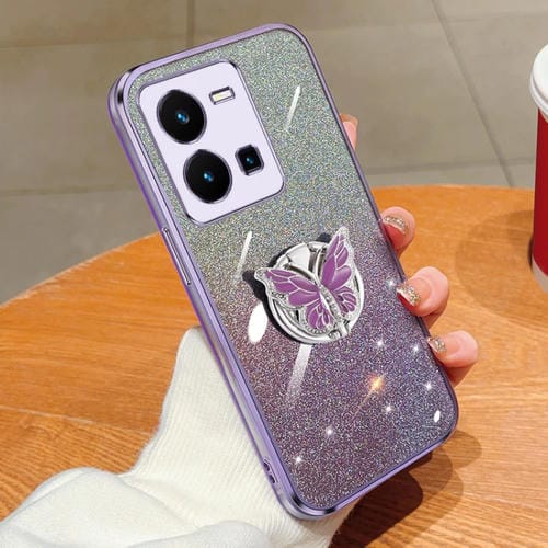 Para Vivo Y35 Global 2022 Estuche para Teléfono de TPU con Soporte de Mariposa con Brillo Degradado Plateado (Púrpura)