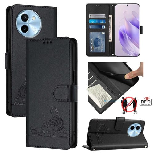 Para Vivo Y38 5G Cat Rat Estuche para Teléfono de Cuero Rfid con Patrón En Relieve y Cordón (Negro)