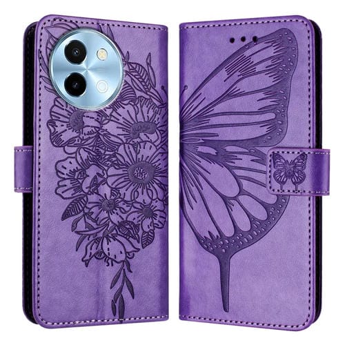 Para Vivo Y38 5G Funda de Cuero con Mariposa En Relieve (Púrpura Claro)