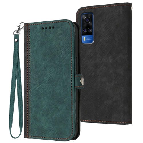 Para Vivo Y53S 4G / Y51A / Y33 4G Funda de Cuero para Teléfono con Correa de Mano con Doble Pliegue y Hebilla Lateral (Verde Oscuro)