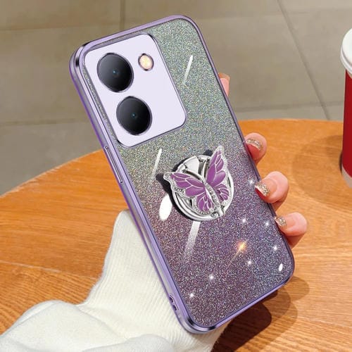 Para Vivo Y78 Funda para Teléfono de TPU con Soporte de Mariposa con Brillo Degradado Plateado (Púrpura)