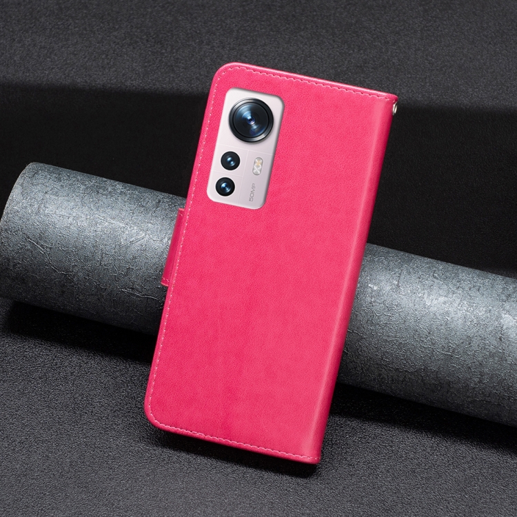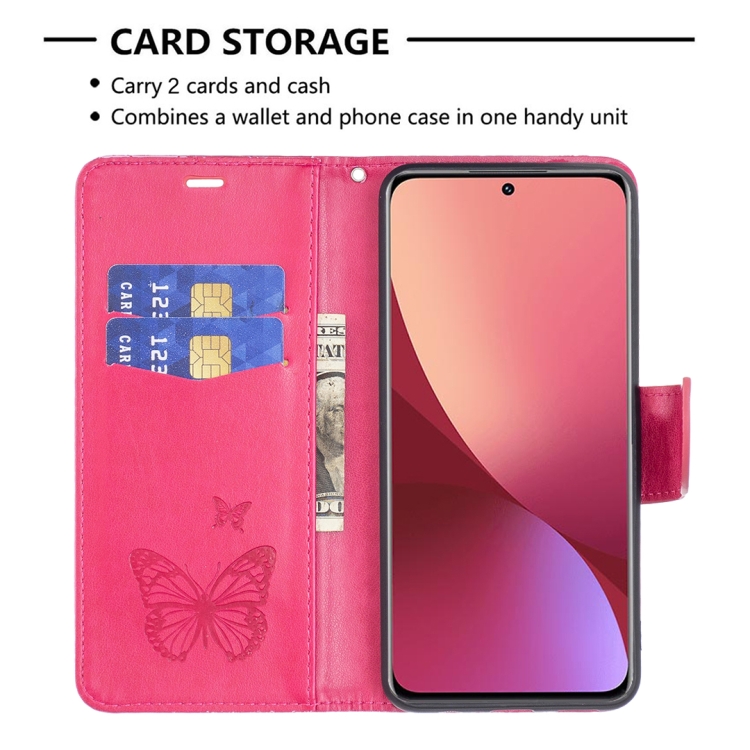 Para Xiaomi 12 Case de Teléfono de Cuero En Relieve de Dos Mariposas (Rosa Roja)