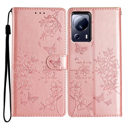 Para Xiaomi 13 Lite Funda de Cuero para Teléfono con Mariposas y Flores (Oro Rosa)