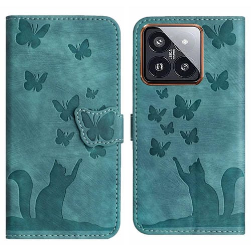 Para Xiaomi 14 Butterfly Cat Funda De Teléfono De Cuero Con Tapa En Relieve (Wathet)