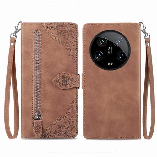 Para Xiaomi 14 Funda De Cuero Con Cremallera Y Flores En Relieve Ultra (Marrón)