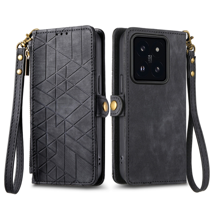 Para Xiaomi 14 Pro Funda De Teléfono De Cuero Con Hebilla Lateral Y Billetera Con Cremallera Geométrica (Negro)