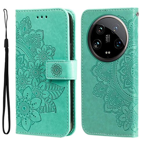 Para Xiaomi 14 Ultra Funda De Cuero Con Estampado De Flores De 7 Pétalos (Verde)