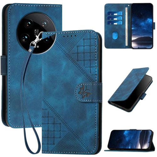 Para Xiaomi 14 Ultra Yx0080 Grid Butterfly Patrón En Relieve Funda De Cuero Con Tapa Para Teléfono Con Cordón (Azul Oscuro)