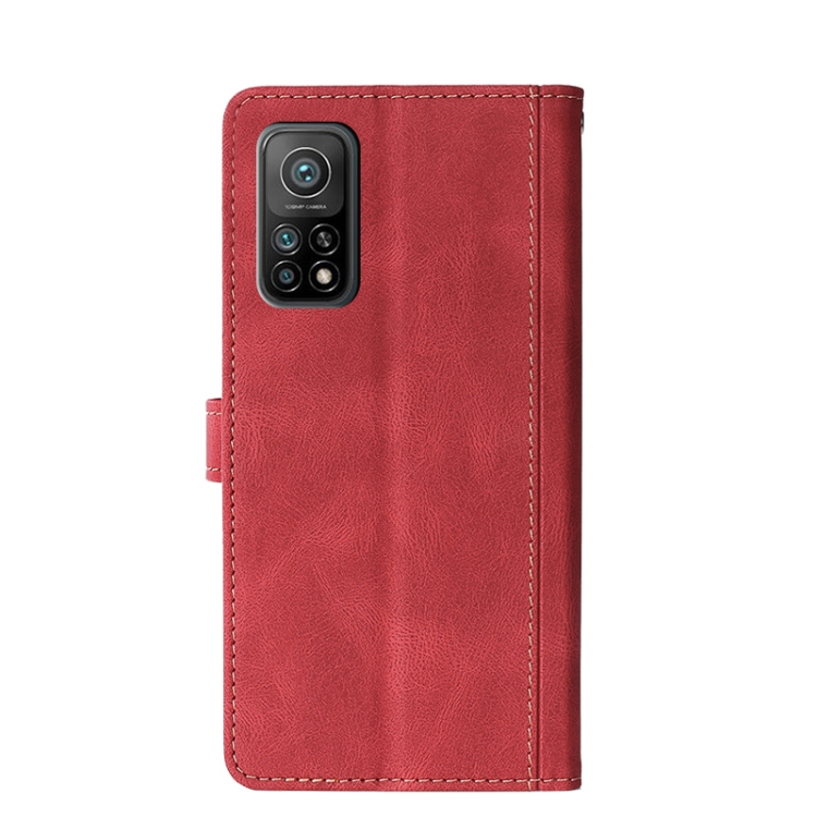 Para Xiaomi Mi 10T / 10T Pro / Redmi K30S Piel de Costura Siente la Hebilla Magnética Funda de Cuero de la Pu de la Pu con El Soporte y Las Ranuras y la Cartera (Rojo)