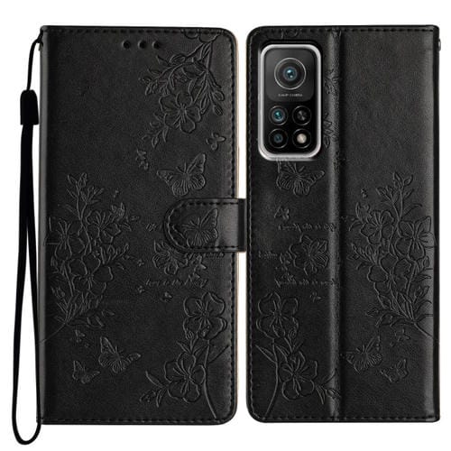 Para Xiaomi Mi 10T Pro 5G Funda de Cuero para Teléfono con Mariposas y Flores (Negro)