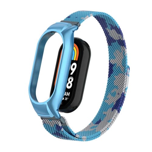 Caja de Metal integrada para Xiaomi Mi Band 8 + Banda Magnética Milanesa (Camuflaje Azul)