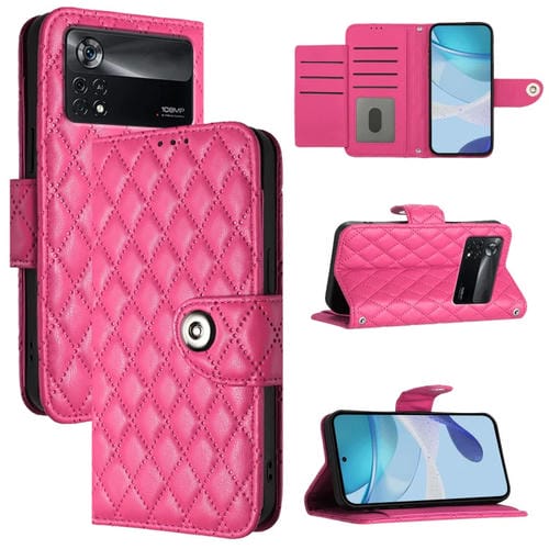Para Xiaomi Poco X4 Pro 5G Funda para Teléfono con Tapa de Cuero con Textura Romboidal y Cordón (Rojo Rosa)