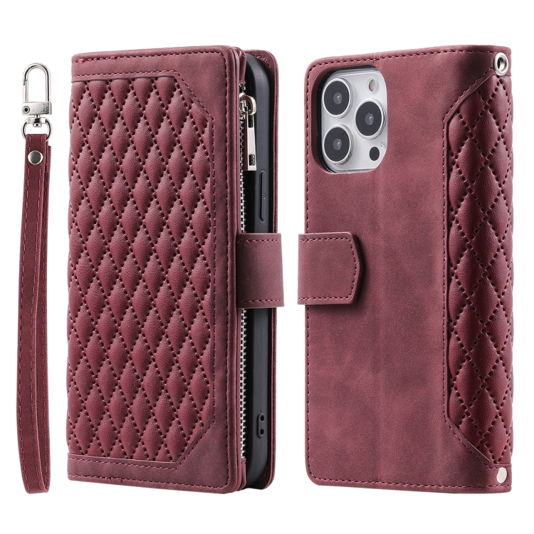 Para Xiaomi Redmi 13 4G Funda de Cuero con Cremallera y Textura de Rejilla con Cordón (Rojo Vino)