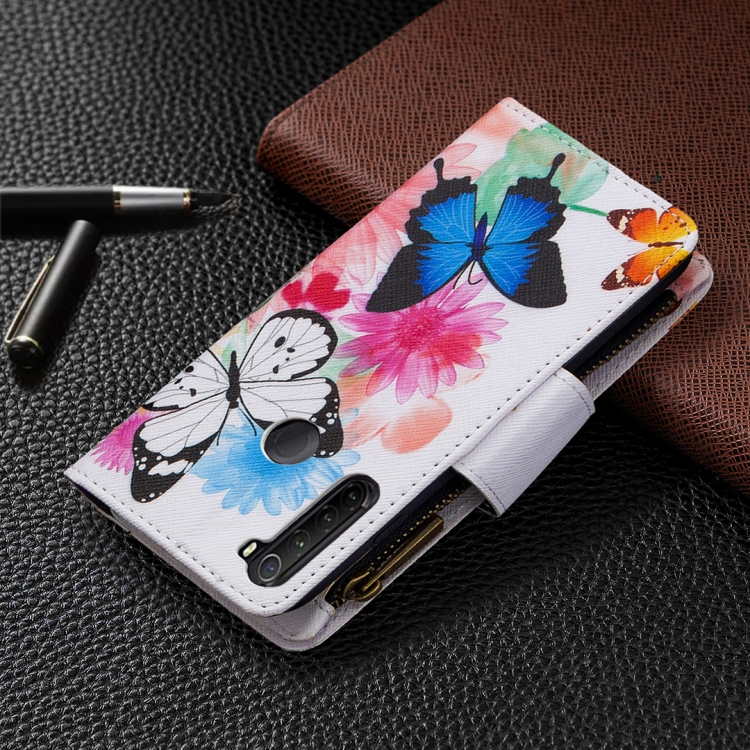 Para Xiaomi Redmi Note 8T Patrón de Dibujo de Colores Cremallera Funda de Cuero con Tapa Horizontal con Soporte, Ranuras para Tarjetas y Billetera (Dos Mariposas)