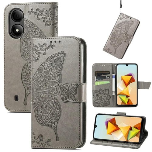 Funda para ZTE Blade A33S de Cuero con Relieve de Flor y Mariposa (Gris)