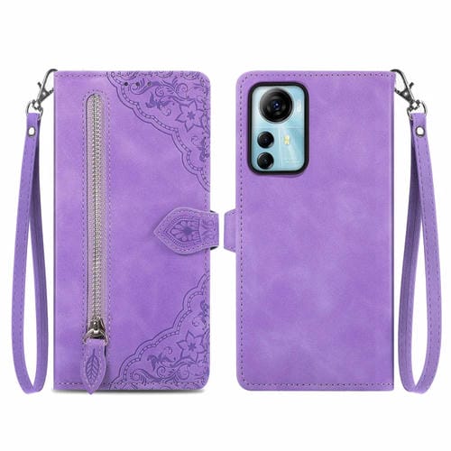 Funda de Cuero para ZTE Blade V41 con Cremallera y Flor en Relieve Inteligente (Púrpura)