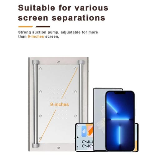 El separador de Pantalla Phone Baku BA-946 de 9 pulgadas es un equipo profesional diseñado para la separación eficiente y segura del Vidrio y la Pantalla LCD en dispositivos Móviles y tabletas. Este modelo cuenta con un sistema de calentamiento continuo que mantiene una temperatura estable entre 50 y 120 grados Celsius, minimizando el riesgo de daños durante el proceso de reparación. Equipado con una potente bomba de vacío, garantiza una succión confiable para facilitar la manipulación de Pantallas de hasta 9 pulgadas. Además, incluye una herramienta específica para la eliminación de Adhesivos residuales, optimizando la limPieza posterior a la separación. Compatible con dispositivos que requieren un voltaje de 220V UE, este separador es ideal para técnicos y usuarios que reparan por cuenta propia, ofreciendo una solución integral para la reparación de Pantallas con un consumo máximo de energía de 450W.