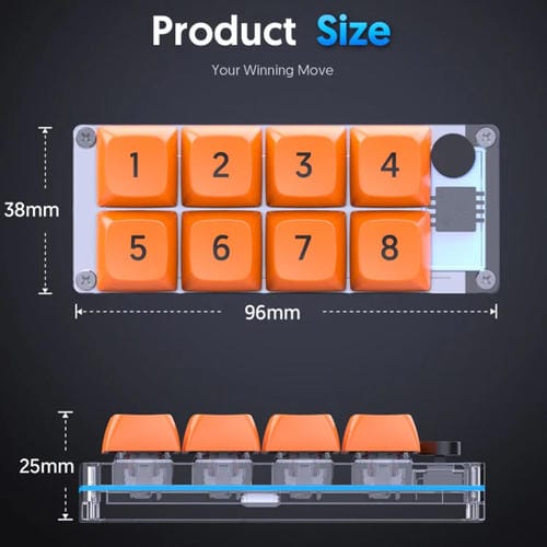 - 8 teclas programables con macros, diseño intercambiable en caliente compatible con interruptores de 3 o 5 pines, Cable de aproximadamente 1 metro, peso aproximado de 150 gramos, tamaño de 9,6x3,8x2,5 cm, 4 modos de efectos de luz multicolor