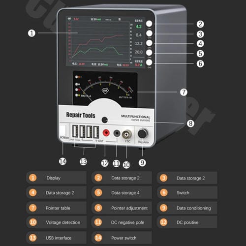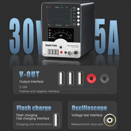 - Potencia de 150 W, voltaje ajustable hasta 30 V, Corriente ajustable hasta 5 A, salida de alta frecuencia, visualización hiperbólica de Corriente y voltaje, incluye funciones de Carga rápida y Carga normal, memoria para almacenar hasta cuatro grupos de configuraciones