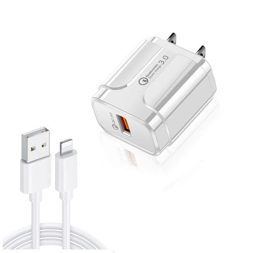 Cargador de viaje portátil Lz-023 18W QC 3.0 USB + cable datos 8 pines USB A enchufe EE. UU. (Blanco)