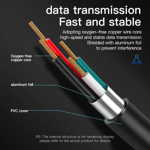 - Transmisión de datos estable y protegida contra interferencias gracias al núcleo de cobre libre de oxígeno y lámina de aluminio