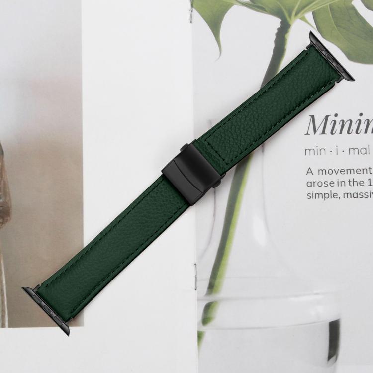 Correa de cuero con hebilla trasera de tortuga negra y textura de lichi para Apple Watch de 42 mm, 41 mm, 40 mm y 38 mm (verde)