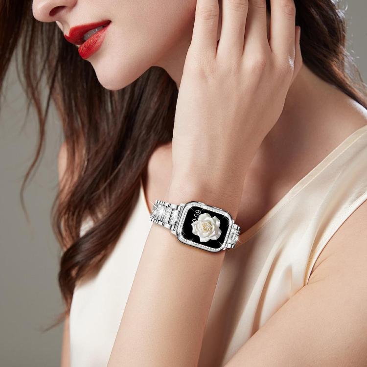 Correa de metal con diamantes y estuche para Apple Watch Series 44 mm xDfind (plateada)