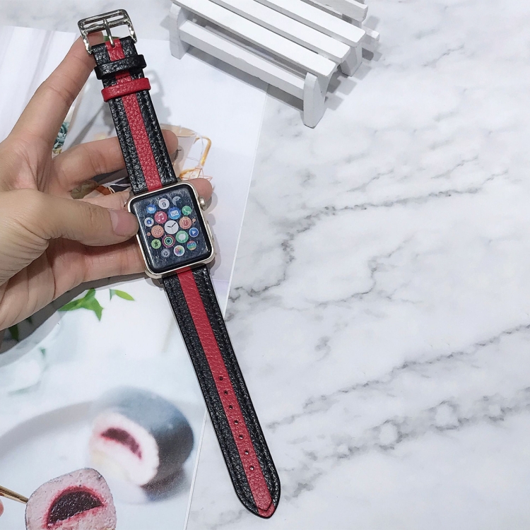 Correa de Reloj Cuero Textura Lychee Costuras Dos Colores para Apple Watch Series 8 y 7 41mm / SE 2 y 6 y SE y 5 y 4 40mm / 3 y 2 y 1 38mm (Negro Rojo)