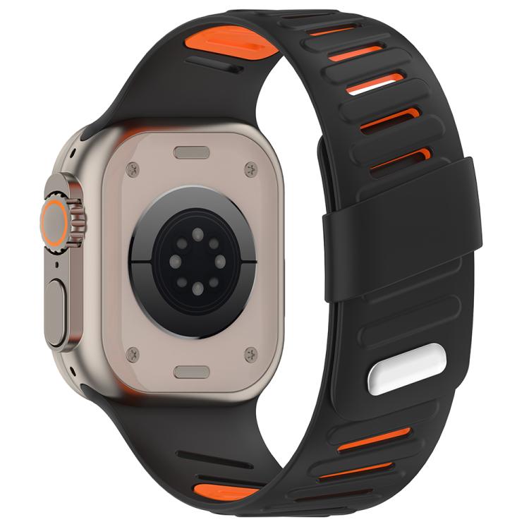 Correa de silicona transpirable bicolor con hebilla oblicua para Apple Watch de 46 mm, 49 mm, 45 mm y 44 mm (negro y naranja)
