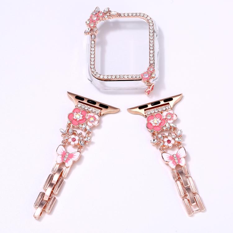 Correa hueca con un solo diamante y borlas de flores para Apple Watch Series 10/11 de 42 mm (oro rosa)