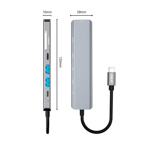 El Adaptador estación de acoplamiento Enkay Hat-Prince 7 en 1 es un dispositivo multifuncional diseñado para ampliar la conectividad de equipos con Puerto USB Tipo-C. Compatible con laptops, tablets y smartphones que soportan protocolo PD, este Adaptador integra múltiples Puertos que facilitan la transferencia de datos, la Carga rápida y la salida de video en alta resolución. Su función principal es ofrecer una solución centralizada para conectar simultáneamente dispositivos externos como Tarjetas de memoria SD y Micro SD, periféricos USB y Pantallas HDMI 4K, optimizando la productividad y la experiencia audiovisual.