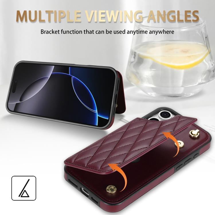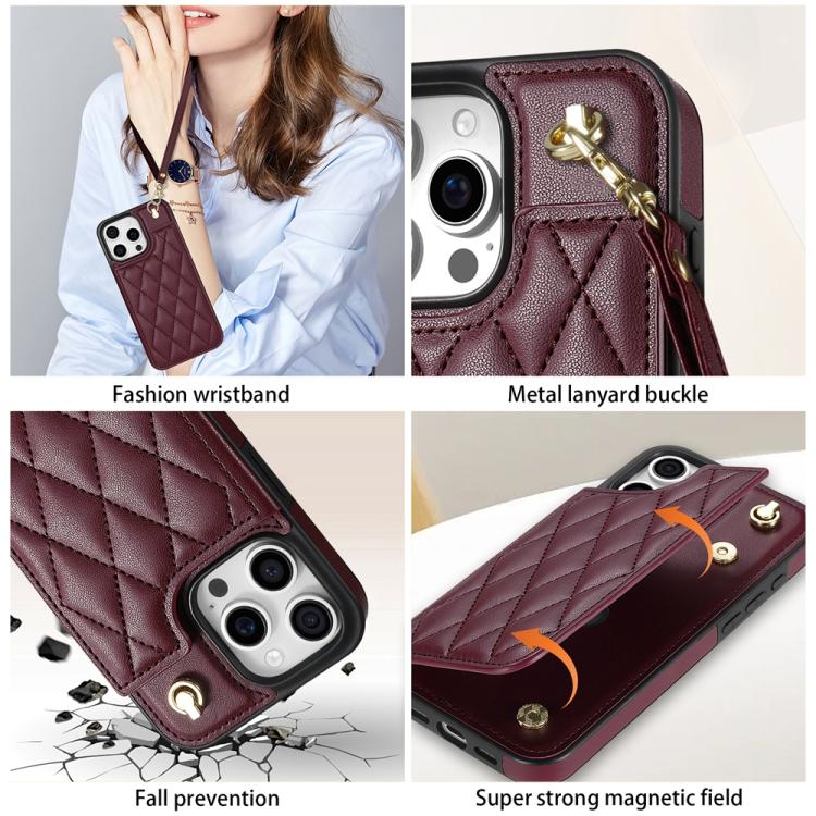 Estuche para Teléfono iPhone 13 Pro Max Ranuras para Tarjetas Hebilla Doble Rombal con Cordón (Rojo Vino)