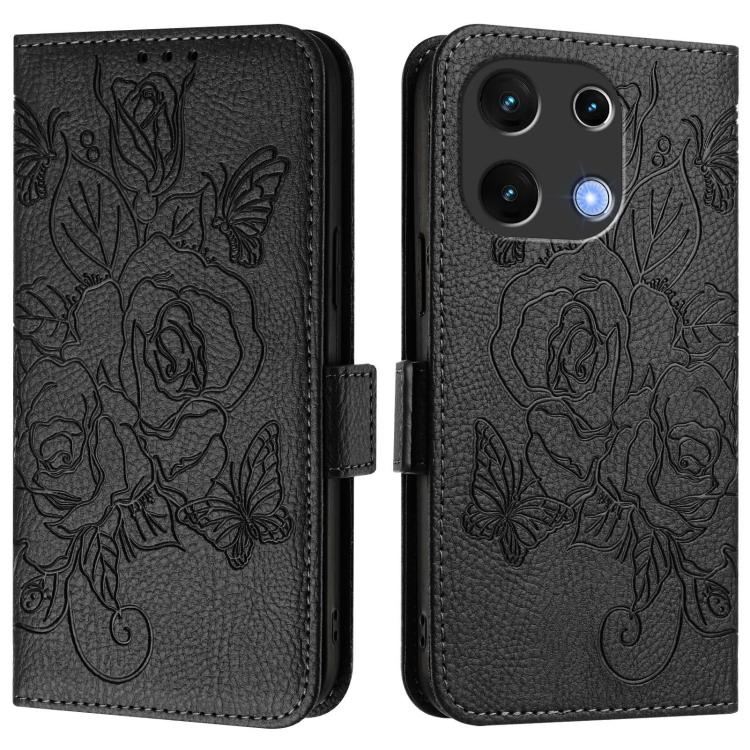 Funda de Cuero Antirrobo RFID para Umidigi Note 100 con Diseño Rosa En Relieve (Negra)