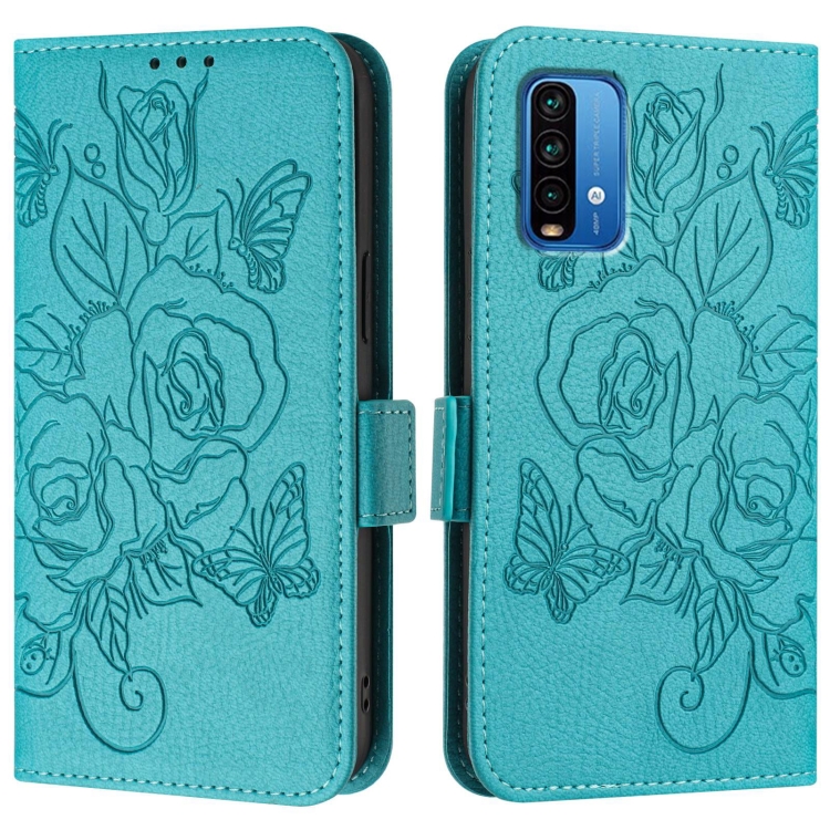 Funda de Cuero Antirrobo Rfid con Relieve Rosa para Redmi 9 Power / 9T / Xiaomi Poco M3 (Azul Claro)