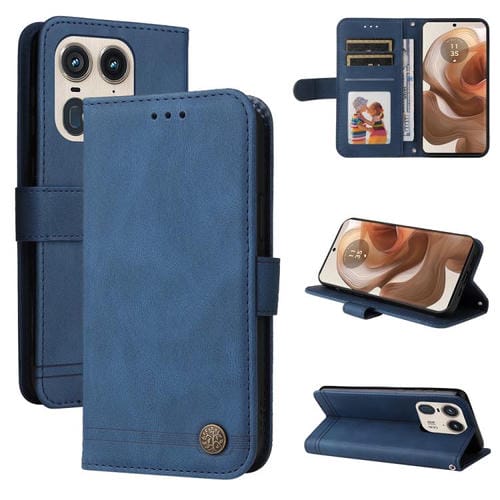 Funda de Cuero Motorola Edge 50 Ultra/X50 Ultra con Botones de Metal y Diseño Árbol de la Vida (Azul)